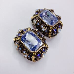 Features: Signed clip-on earrings; dimensional construction with ornate scrollwork; large rectangular faceted blue stone centerpiece; multi-color rhinestone and opalescent cabochon accents; antique gold tone finish; secure clip backs