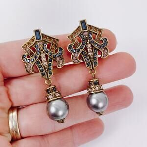 Features: Jeweled scrollwork design; rich multicolor sparkle; substantial faux pearl drops; ornate metalwork; clip-on backs; solid construction consistent with designer's reputation; antiqued gold tone finish