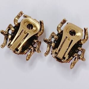 Features: Sculpted ladybug motif; red crystal pavé; pearl-like white cabochons; gold tone metal legs and body; clip-on backs; signed underside