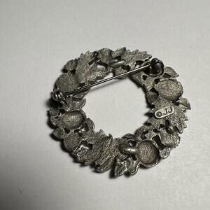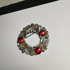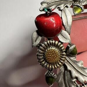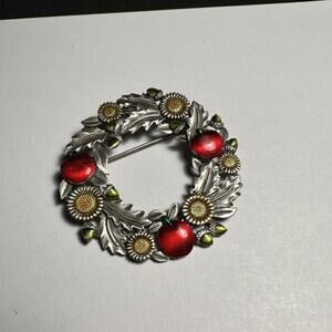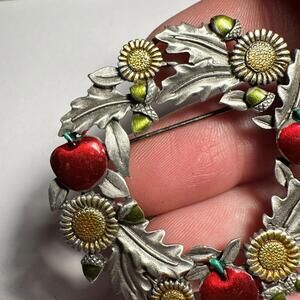 Signed JJ Red Apple & Sunflower Wreath Brooch Pin Pewter Tone Jonette Jewelry