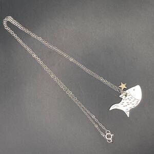 An artisan handmade sterling silver etched fish with small 10k gold star charm pendant necklace.
