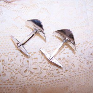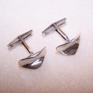 Possibly made by Jenni Rogers of England, may I offer this pair of Sterling Silver (hallmarked as pictured) cufflinks - cuff links. In a sort of thumb print design with curved sides, the concave pair of wrist sparklers have fronts that measure 7/8" high x 11/16". Depth is about 5/16". Combined weight of the set is 8.5 grams. Link mechanisms works as they should and the pair is in great condition with only a touch of tarnish still remaining to the set. Plain silver links perfect for lady or gent.