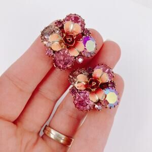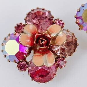 Features: Signed clip-on backs; layered enamel flower center; prong-set rhinestones including aurora borealis stones; dimensional floral construction; pretty pink color