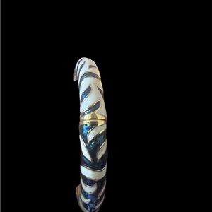 Make a statement with this stunning signed Kenneth Jay Lane (KJL) enamel bangle bracelet. Featuring bold cobalt blue enamel with elegant ivory-white swirl detailing, this hinged gold-tone bracelet is the perfect mix of sophistication and flair — a true hallmark of KJL’s timeless design.