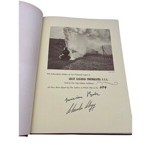 This is a signed limited edition of Great Railroad Photographs, U.S.A. by Lucius Beebe & Charles Clegg (Howell-North, 1964). Large format (12.25″ × 9.25″), 243 pages of photographic plates and railroading scenes. The copy is signed by the authors and numbered (one of 2,000). A collector’s edition prized by rail enthusiasts and photography book collectors alike.