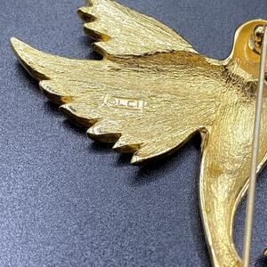 This signed Liz Claiborne rhinestone hummingbird brooch pin is a vintage piece featuring a beautiful bird shape with blue rhinestones. The gold color and retro theme make it a stylish and unique accessory for women who appreciate art and beauty. The brooch is an original piece from the Liz Claiborne brand, perfect for adding a touch of fashion and costume flair to any outfit.