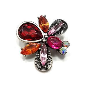The wings showcase orange marquise and light pink navette rhinestones, all bordered by delicate silver tone filigree. A small space above the wing allows this piece to also be worn as a pendant with a bail — a fun dual-purpose design!