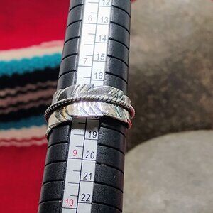 This unique artisan bypass ring features a Native Southwestern feather design. Handmade from sterling silver, it showcases an orange spiny oyster shell centerpiece. The ring is signed by the artist MJ and is adjustable for a custom fit.