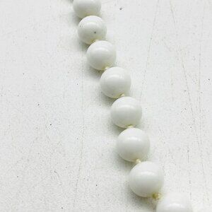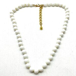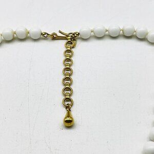 Timeless vintage Monet necklace featuring smooth white beads and gold tone hardware with adjustable chain extender. A classic piece of quality costume jewelry perfect for layering or wearing solo.