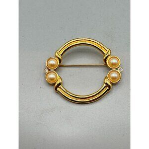 Signed MONET Small Circle Pin Brooch Gold Tone Faux Pearls Elegant Classic Pin