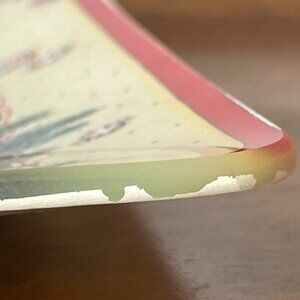 This plate is in good pre-owned condition with various light wear. There is a 2-inch-long scratch on the right of the plate that's not too noticeable unless under direct light (please see last photo). There is a minuscule chip on the left edge; it's rather smooth and might be a manufacturing flaw (see second-to-last photo). Finally, there are some small scratches and scuffs on the back of the plate where the graphic has worn away that are visible on the front. Please see the several photos before the final two. The border scuffs are only visible from certain angles.