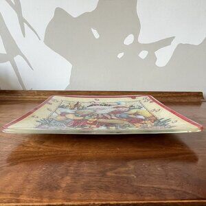 This plate measures 10 3/8" square and would work nicely for serving holiday cookies and treats. The platter features three children hugging Santa Claus, peppermints along the border, and a red outer border. Engelbreit's autograph / signature and "2014" are in pen toward the bottom of the plate.