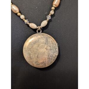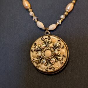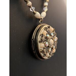 Signed Michal Golan Pearl Crystal Victorian Locket 18"-21.5" Necklace. Pre-owned, this antique look necklace is in excellent condition. Really beautiful! Locket closes well.