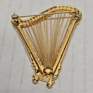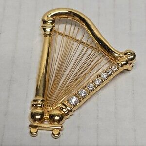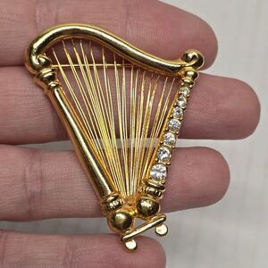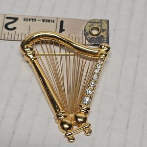 Signed Monet Gold Tone Harp Music Instrument Rhinestone Spinneret Brooch 2-1/8”