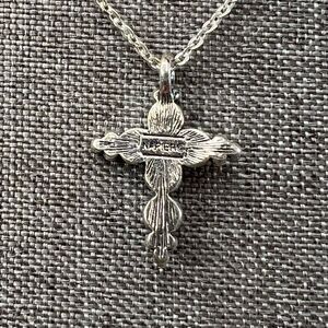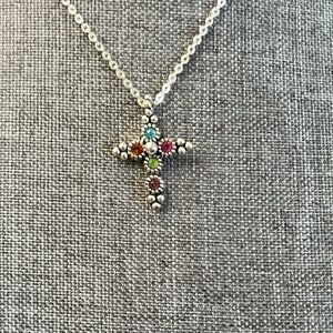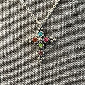 Beautiful silver necklace featuring a cross pendant adorned with multicolored gemstones.