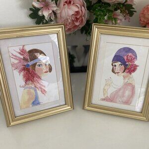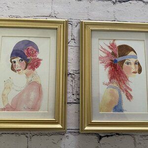 Signed Peg Carlson 2 Illustrations Paintings Flapper Women 8" X 6.5" Framed Vtg