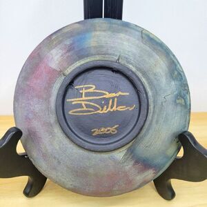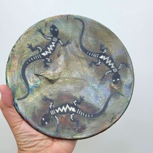 This striking raku-fired ceramic plate is signed by artist Brian Diller and dated 2005. It features a trio of stylized lizards with bold geometric accents, set against a shimmering, iridescent background created by the unique raku firing process. Each piece by Diller is handcrafted and one-of-a-kind. In the light it had an iridescent glaze.