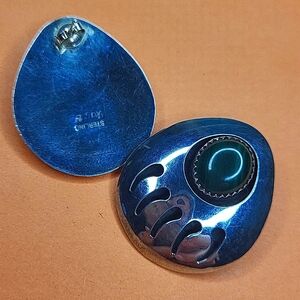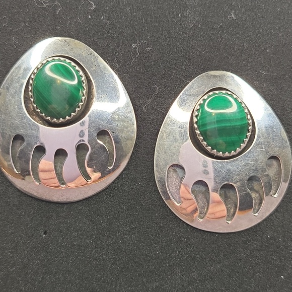 Sterling Silver bear paw earrings signed and designed piece by Ray B. Fantastic quality and condition. Beautiful deep green oval-shaped stone.