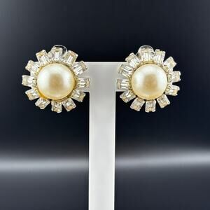 Vintage Silver Tone Faux Pearl and Rhinestone Starburst Clip On Earrings