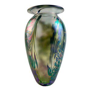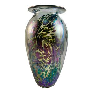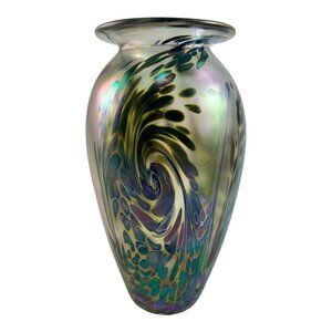 Discover the mesmerizing beauty of this authentic, signed Robert Eickholt iridescent art glass vase, dated 2004. This exquisite piece, often referred to as a "Starry Night" design due to its swirling patterns and shimmering effects, perfectly captures Eickholt's renowned artistic vision.