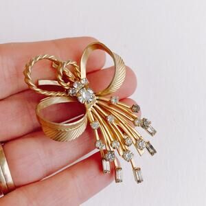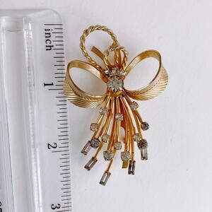Condition: Good used/vintage condition; finish wear on the reverse of the bow loops and on the rope detail; minor wear visible to the gold-tone finish on the front edges of the bow loops and rope; several baguette rhinestones show noticeable foil deterioration and discoloration; no missing stones; pin mechanism works securely; see close-ups. Ships from a smoke-free environment.