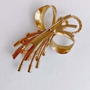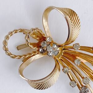 Signed Sarah Coventry Mid Century Gold Tone Rhinestone Bow Spray Brooch