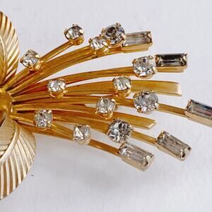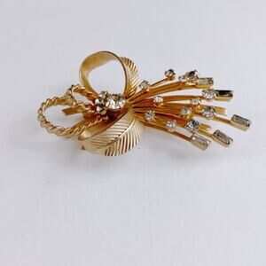 A beautifully crafted example of mid-century costume jewelry, this signed Sarah Coventry brooch blends classic 1950s bow motifs with an elegant spray of baguette and round rhinestones. Its dimensional design and textured gold-tone finish capture the timeless appeal of retro statement pieces.