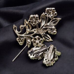 Signed Silver Tone Lisner Brooch & Earring Set Leaf Stemmed Rhinestone Flowers