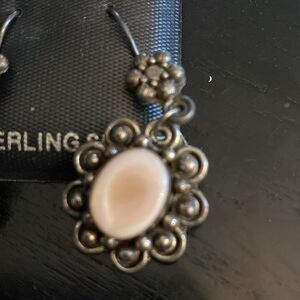 Signed Sterling boho style flower power earrings with pink Mother of Pearl. Patina befitting age. The cut of the Sterling gives some texture and a little shine. Estate sale find.