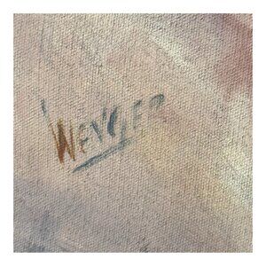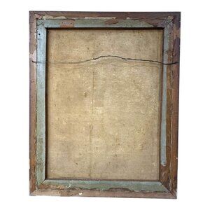 Frame shows age-related wear, minor paint chipping along edges. Painting measures approximately 24 x 30 inches.