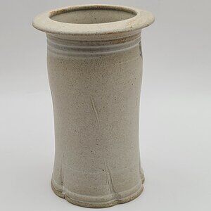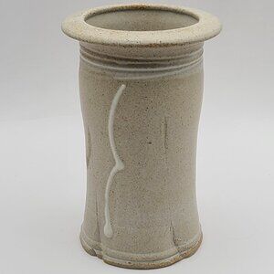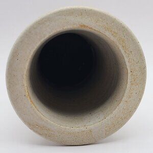 Signed Studio Pottery 5.75" Tall Vase 3.75" Diameter Tan with White Brown Blue