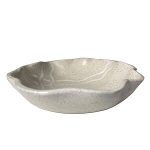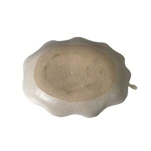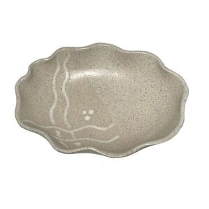 Handcrafted ceramic bowl. Its gently undulating rim and speckled beige finish exude a rustic elegance. Delicate, stylized floral accents dance across the interior, catching the light and adding a touch of whimsy. The bowl's shallow depth makes it ideal for displaying small treasures or serving decorative items. Signed by the artist on the base, this unique piece adds personality to any space. Perfect for holding jewelry on a bedside table, serving snacks at a casual gathering, or adding a touch of artistic flair to a bookshelf.