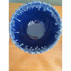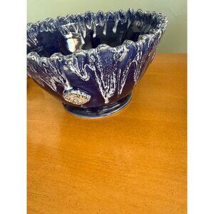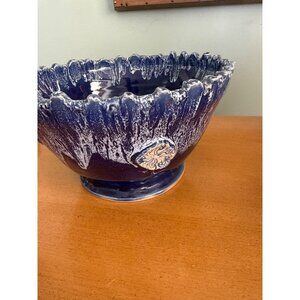 Signed Studio pottery Bowl With Drip Glaze & Textured Edge - Blue & White