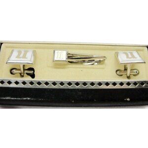 Signed Swank Set Silver Tone Square Cufflinks Neck Tie Clip Shirt Vintage IOB