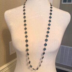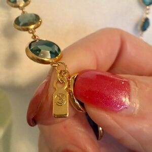 Gold tone necklace has bezel set blue crystal. No clasp, pullover. Necklace is intact. Excellent functional vintage piece. Measurement 17 1/2 inches in Length