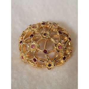 This exquisite brooch pin is a true masterpiece that is sure to turn heads. Crafted by the renowned brand Swarovski, this piece is a perfect addition to any jewelry collection. The round dome shape and the beautiful pink crystal main stone make this brooch a stunning piece that will complement any outfit. The gold tone base metal adds a touch of elegance to the overall design.
