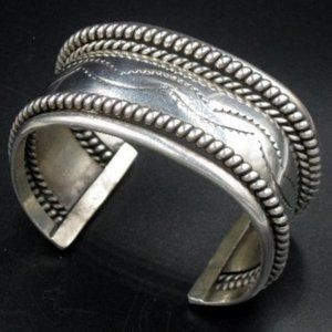Crafted in heavy sterling silver, this wonderful Navajo bracelet was made by a member of the Tahe family from northern Arizona. The heavy sterling cuff features stamped accents and raised twisted cables. It measures 1 3/8" wide and weighs 73 grams. The bracelet measures just a hair over 2 1/8" in diameter with an opening of 1 1/8", fitting a small to medium wrist.