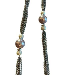 This necklace features a multi-strand design with a polished silver-tone finish and elegant faux pearls, offering a refined accessory option.