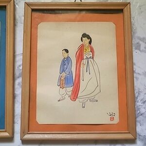 Signed Traditional Asian Korean Folk Art Man Woman w child Set of 2