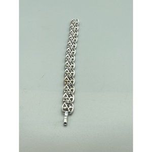 Tags: TRIFARI bracelet, silver tone, faux pearls, vintage jewelry, 7 inch bracelet, signed TRIFARI, pearl bracelet, classic jewelry, elegant bracelet, costume jewelry, metal links, braid style links, statement jewelry, gift for her
