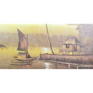 Vintage Signed Tropical Landscape featuring a Sampan, Hut On Stilts & Palm Tree Oil On Canvas Framed 26.5"x19.5"
