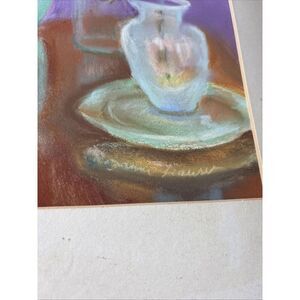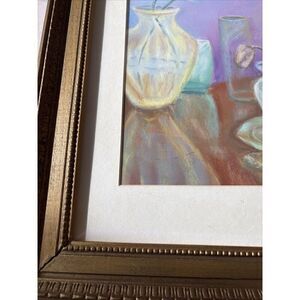 Signed pastel. Framing makes it look vintage. Frame is taped together and it doesn’t sit straight in frame. Frame missing pieces of backing. Will need to be reframed or altered. Wear commensurate with age, including dings, nicks, and scratches to frame. Cool piece!