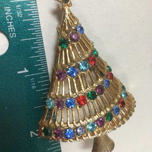 Vintage collectible Christmas tree brooch holiday pin made with gold tone metal featuring a multicolored jewel-tone set of rhinestones. Comes with presentation style box perfect for gift giving or collectors. Measures approx. 2.5"