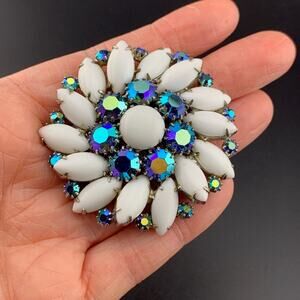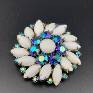 Silver Tone White Glass Peacock Aurora Borealis Rhinestone Brooch