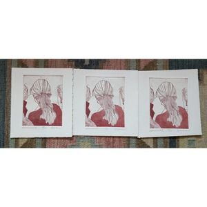 I am offering for sale the remaining prints in a limited edition of 20 that I pulled in 1991. Titled "Adornments", it is an intaglio print of the back view of a woman's head. Her hair is tied back loosely in a bow. There are two other girls in the frame, the face on the right is barely visible with a dangling earring. I designed this print to be my logo for the jewelry and hair ornaments I was making at the time. Each print is signed by me (the artist) and numbered. The plate has been destroyed, so no more prints can be pulled from it. I do sell reproductions of this print that can be purchased on a plethora of products through Redbubble, but in this case you would be purchasing an original piece of artwork. Thank you for your interest in supporting my art! I tried to give a good representation of how print makers strive to have each pull from the plate in a series look as much the same as possible. There were many artist proofs that did not make it into the cut. Please refer to the pictures to see the prints that are available and choose accordingly. I have taken pictures of rows of three, beginning with 5/20, 6/20 and 7/20. The first four prints and 17/20 have sold. Some prints are a bit crooked on the paper, which can be corrected with proper matting.