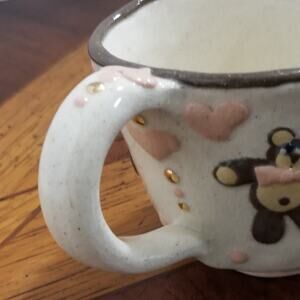 Signed coffee mug pottery/clay teddy bears and hearts Signed Natalie Ying 1984