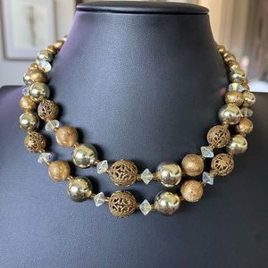 Signed Lisner Vtg Double Strand Gold Tone Open Work Filigree AB Beaded Necklace