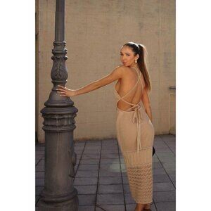 The perfect piece to take away with you on your next vacay ~ the Abby Halter Dress in Biscuit is crafted from our luxurious knit fabrication. Halter neckline, open back detail with adjustable tie and crotchet detail through the bodice and hem. Pair with a simple slide for a complete look.
