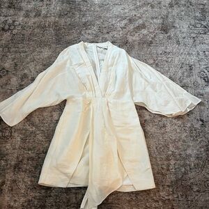 The fabric is a Mid-weight, non-stretch slubbed weave 3/4 split batwing sleeves with split, asymmetrical cuffs Shell: 55% linen/45% viscose. Lining: 97% polyester/3% elastane