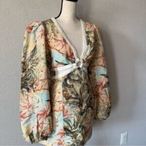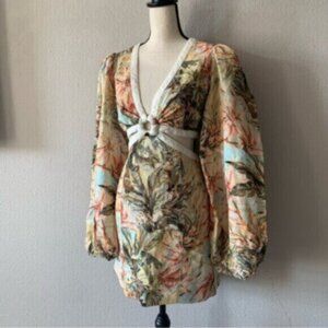 "Madrid Mini Dress" is a stunning and vibrant piece that perfectly balances elegance and playfulness. The dress features a unique and eye-catching floral print in soft, pastel tones of green, orange, and blue, creating a delicate, summery vibe.The design includes a plunging V-neckline with a central ring detail that gathers the fabric and adds a touch of sophistication. This ring detail also creates a flattering cut-out effect at the midriff, accentuating the waist and adding a modern twist to the classic mini dress silhouette.The long, billowing sleeves are another standout feature, providing a contrast to the fitted bodice and skirt. These sleeves are gathered at the cuffs, creating a slight puffed effect that enhances the overall feminine and romantic feel of the dress.